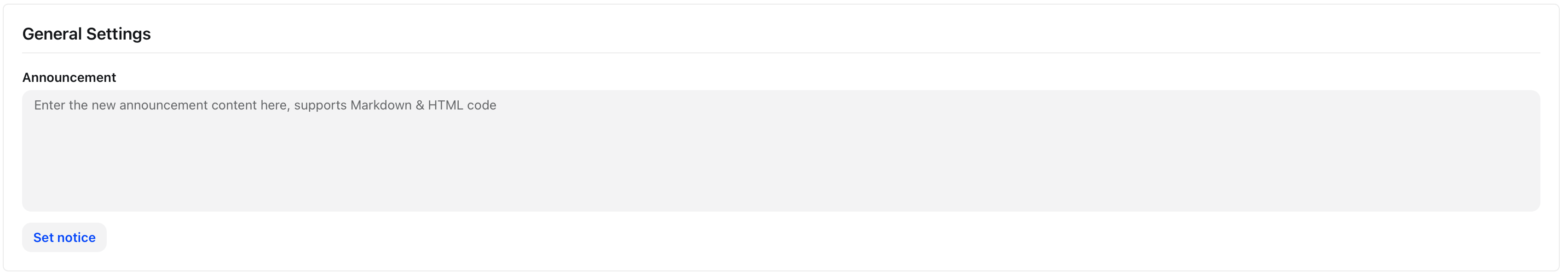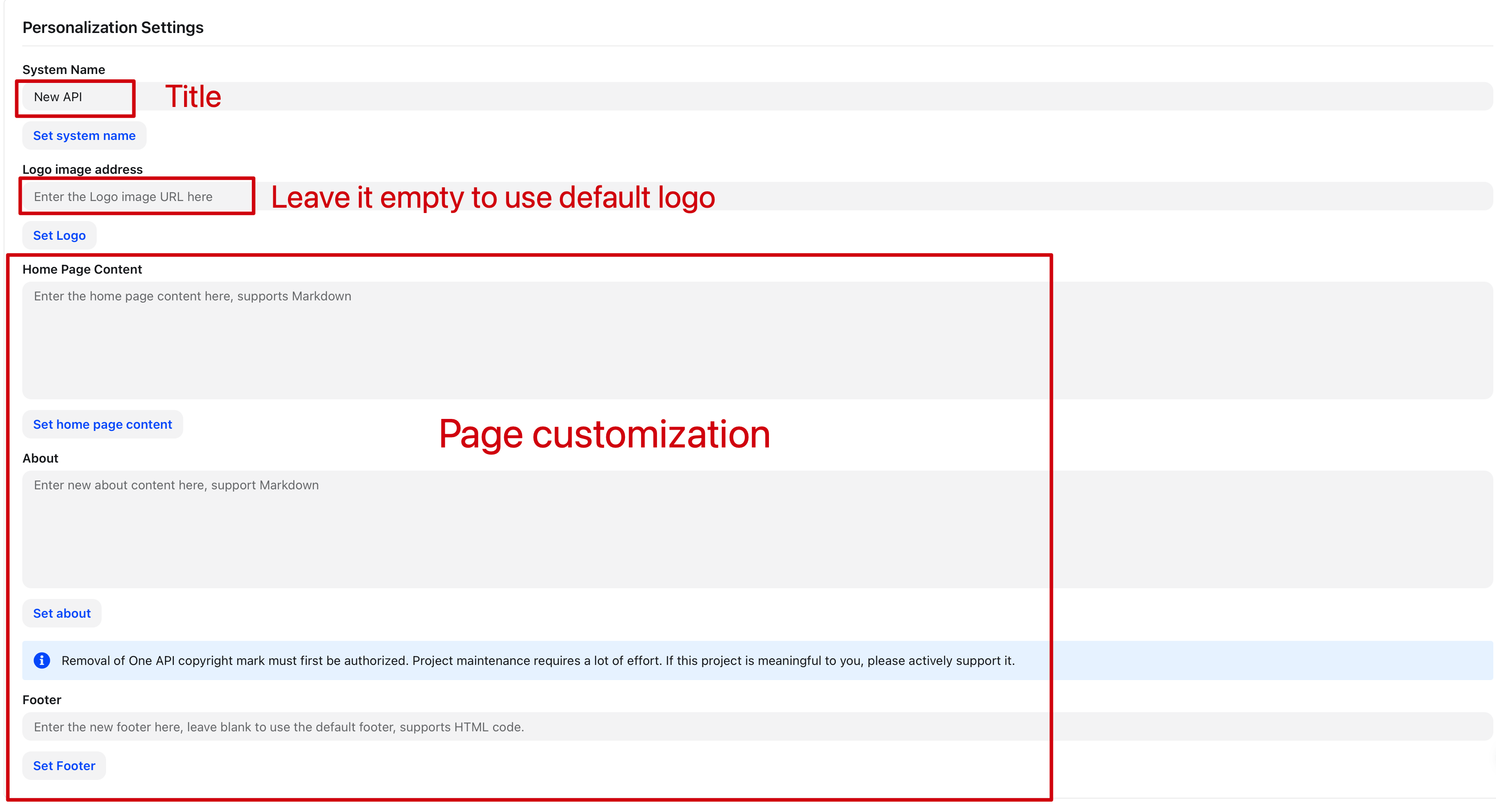 Here you can check for NewAPI updates, set announcements, and customize the page.